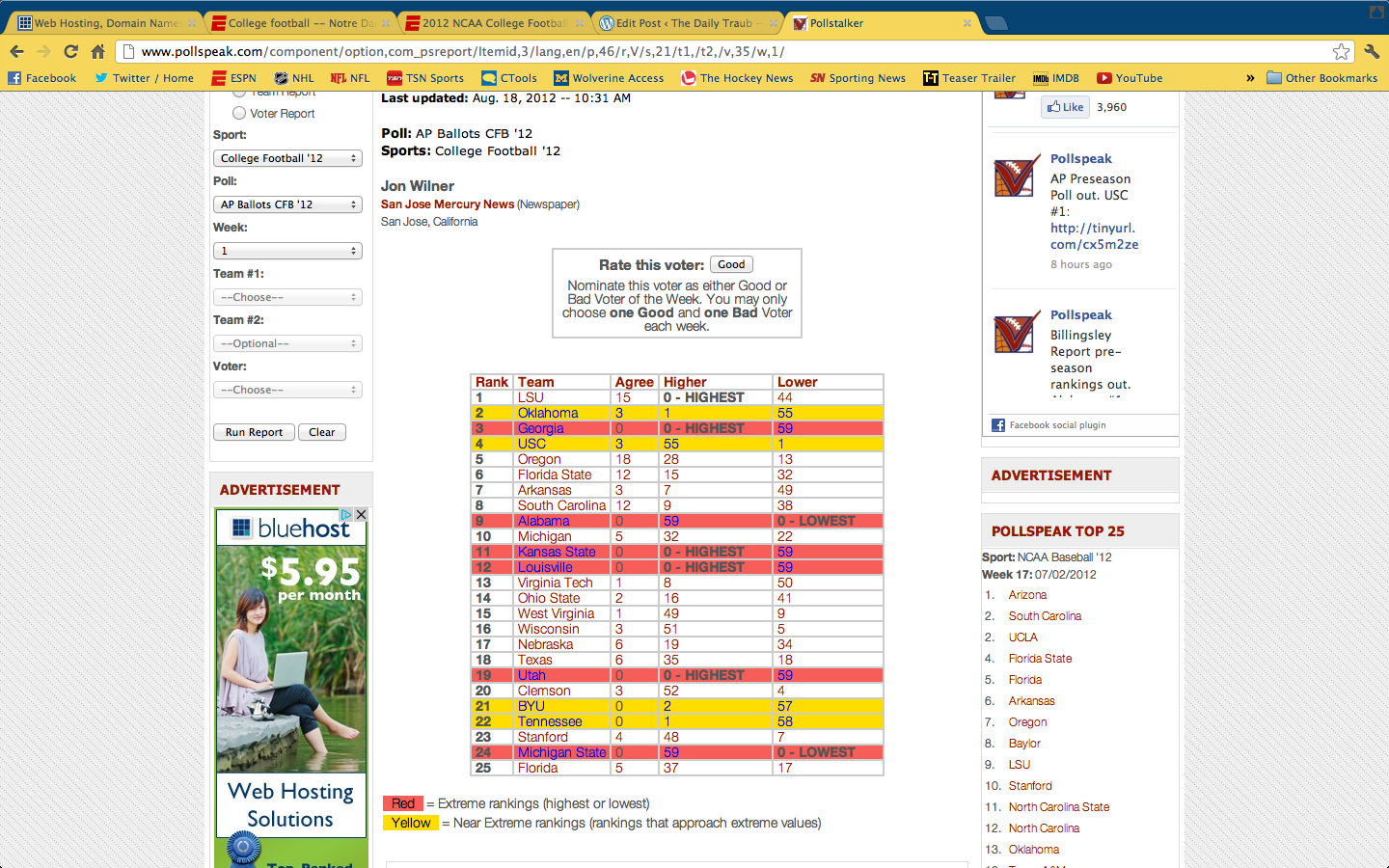 Like, are ya serious? If you want to keep track of these all year, go to pollspeak.com, then you have to maneuver through to the college football 2012 page, but I highly recommend it if you have some serious free time. It’s interesting to see how each person is voting, which newspaper/media outlet they work for, and so on. I truly wish that these people would either learn about college football, or stop voting in the AP poll, or just stop projecting their views onto everyone. Imagine living in San Jose and having to read this guy’s columns each week, it would be an embarrassment. And for those keeping score at home, you do not want to have team name’s highlighted in red, that means you are at the extreme high or low for a team. And they only do it when people do not agree with you, this isn’t like, “oh hey, congrats you’re different, you must be smart;” it’s like, “excuse me sir, have you recently suffered a closed-head injury?”