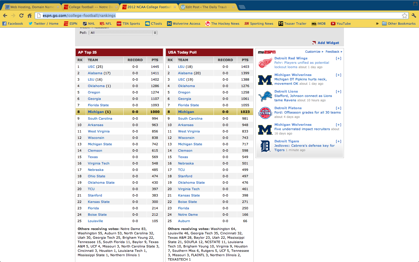 Anyways moving on from my depressing take on life, these polls are why people voting should not have any effect on the National Championship, and why the media shouldn’t be allowed to award their own National Championship trophy. It’s completely ridiculous; Michigan ranked #8? Overrated. Michigan getting a first place vote? Seriously? I’m a bigger Michigan fan than 99.9% of the people I know/have met and if I think is ridiculous, than you know it is ridiculous. Ondre Pipkins just got hospitalized with neck injury, Chris Wormley tore his ACL, Frank Clark and Fitz Toussaint are suspended indefinitely, Roy Roundtree had arthroscopic surgery on his knee, Mike Martin, Ryan Van Bergen, and Junior Hemingway graduated last year, getting the picture? The first three players are defensive lineman that were going to help stem the loss of Martin and RVB, while Fitz is a 1,000+ yard rusher and the starting runningback, and Roundtree is the number one receiver that might not be ready to go by the time they have to go to Dallas, and he was supposed to replace Hemingway. Can someone explain to me how they are supposed to be ranked ahead of USC?