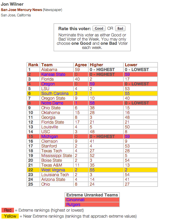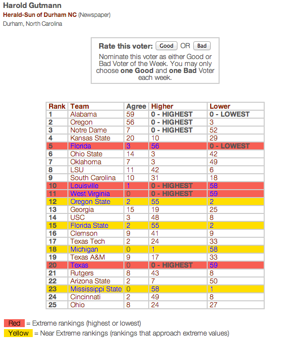 Congrats to Harold on his first Bronze Medal. To be honest, he’s here for only a few reasons. One, Notre Dame #3? Good joke. Florida behind Kansas State? Great joke. Louisville #11? An even better one. And finally, how is Texas still ranked? They got destroyed by Oklahoma, and have no business being in the top 25 after that embarrassment. The rest of this guys poll is decent, but his top five is a joke, along with Louisville. Louisville hasn’t even played a ranked team yet, let alone beaten one.