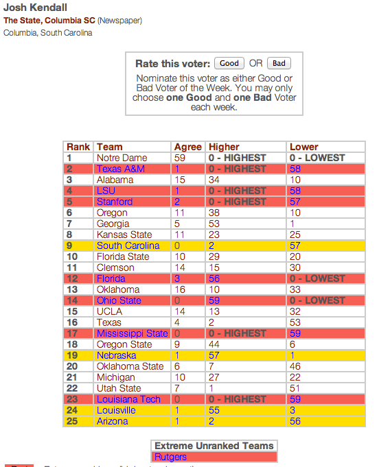 Oregon State being ranked ahead of LSU, Florida and Texas A&M is an absolute joke. Oregon State hasn’t beaten anyone good this season. Then he hoses South Carolina and puts them at #15, behind Louisville? Come on man. Northern Illinois and Kent State being in the Top 20 is completely outlandish as well.