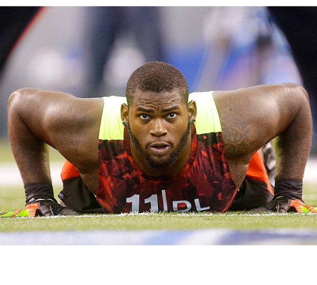Corey Lemonier weighed in at 6’3″ 255 lbs and then ran a very impressive 4.60 40. He put up 27 reps on the bench with a 33″ vertical and showed that he is quick and showed good balance during drills. He does have some stiff hips and has some trouble with his leverage, and will need to show teams that he can be stronger.