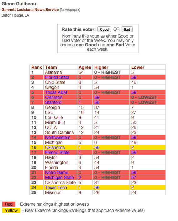 Glenn will just not give it up on Florida State. Jameis Winston is great, but putting the Noles at #2 is a stretch, still. I’m not sure why Fresno State is ranked #17, the only semi-decent team they have beaten this year is Rutgers in OT. Not sure how that makes them deserved of a higher spot than a team like Washington, who barely lost to Stanford, but I guess Glenn is just looking to keep his medal spot.