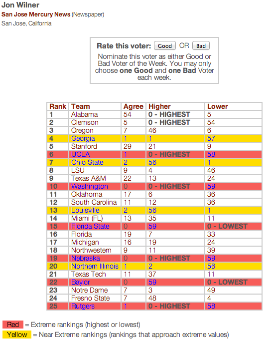It’s always the same damn people. I mean honestly, how do these people still have a vote? I’m a little conflicted here because Oregon and Baylor have some nasty high-powered offenses, and the point totals they have been putting up each week are insane. That being said, neither team has beaten an opponent that is worthy of being ranked in the top 25, so it’s a little bit of stretch to put Oregon at #1 over Alabama, but even more of a stretch to put Baylor at #5. I respect Kendall for putting Louisville outside the top 10, but putting Washington #12 is a bit much for this squad.
