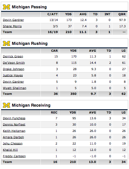 Devin Gardner made some absolutely fantastic reads passing the football and his accuracy was much-improved. There were times he wasn’t quite set for his passes, but his strong-arm helped him get away with it. You don’t go 13/14 for 173 yards and 3 touchdowns by accident, even against App State. He had good pocket presence and made good reads down the field. My only hope is that he doesn’t have his eyes glued to Funchess too much. It would be nice to get some other receivers in the mix so that teams don’t just double Funchess all game.