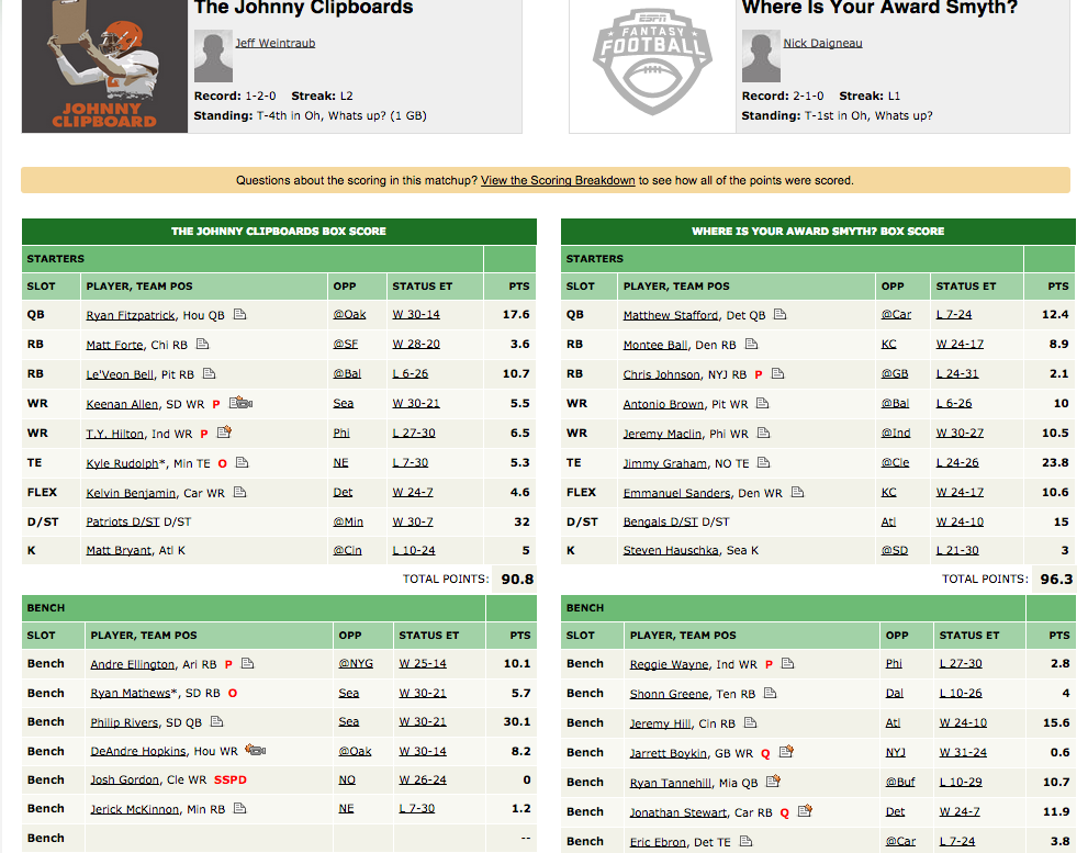 Despite a valiant effort from the Patriots defense to help my sorry team and my poor decisions, I was bested by Nick Daigneau and his team. His running backs are heinous, but my receivers are worse…at least they were during this contest. I’ll have my revenge in the playoffs…hopefully.