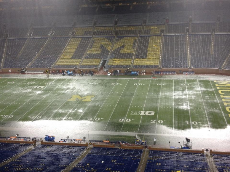 I can’t help but look at this photo and think it’s a high school football game. After the rain delay, this was all that was left at Michigan Stadium. This certainly looks like the death of an elite football program to me.