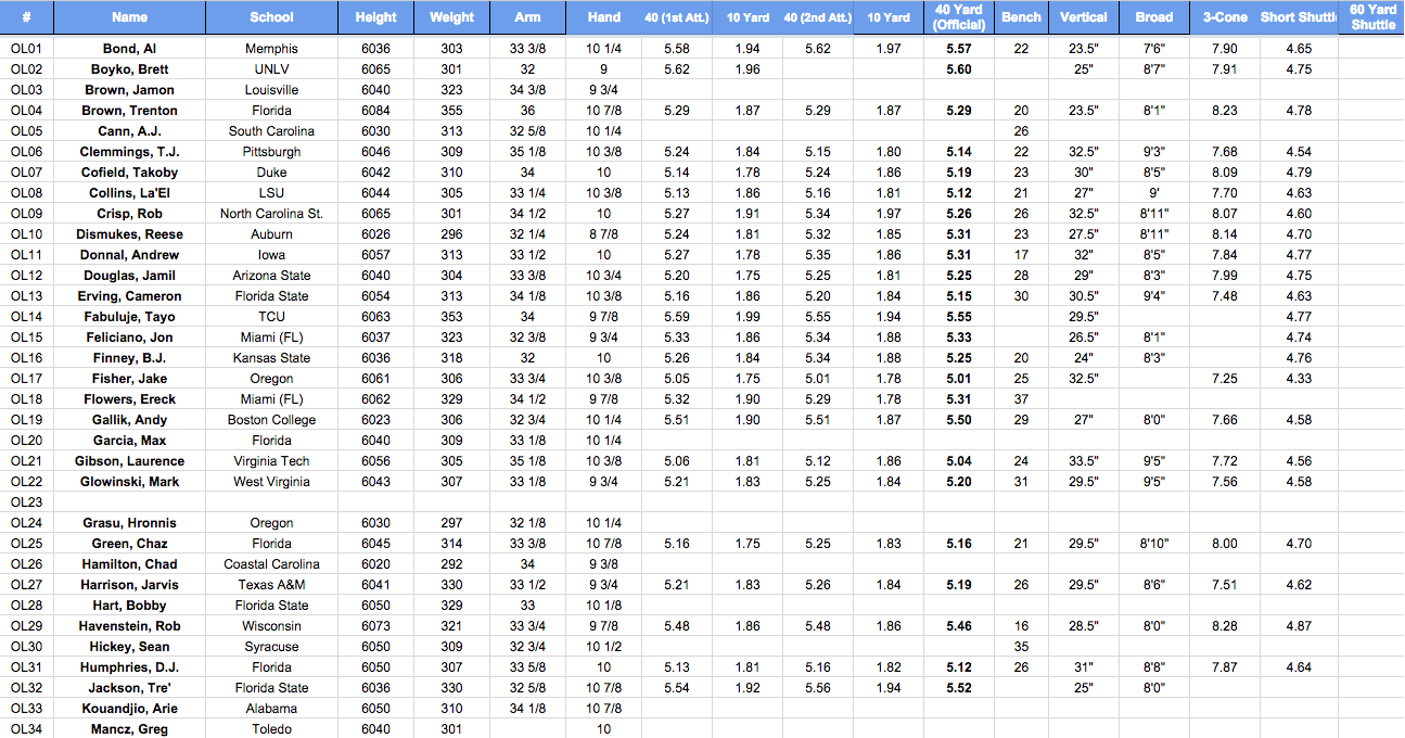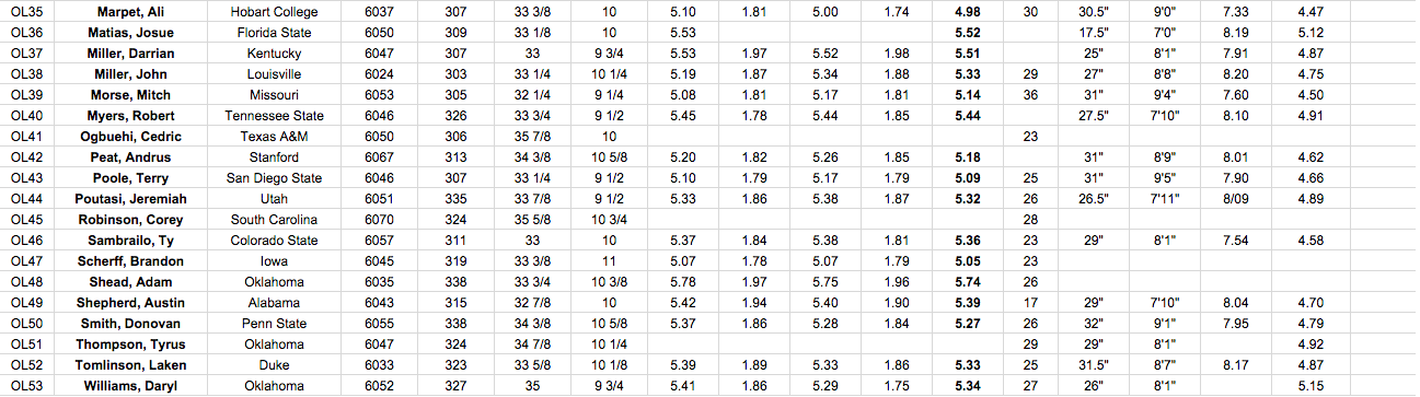 Here are the offensive linemen measurables, a blank means that they did not participate in that particular drill: