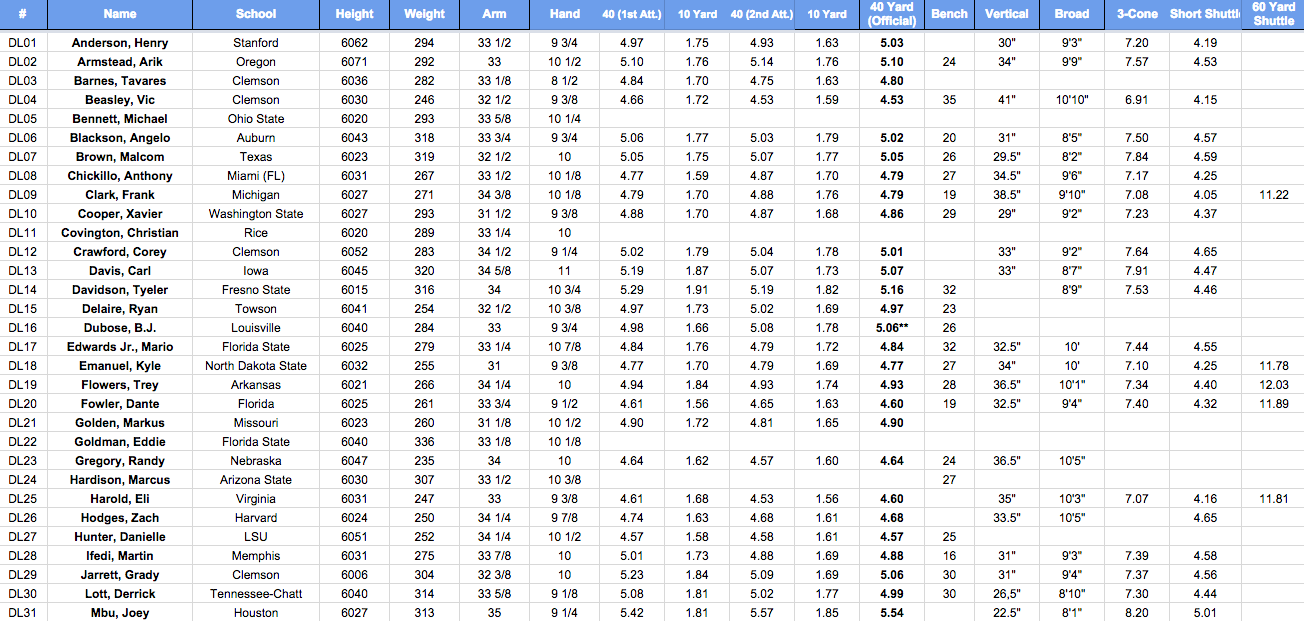 Carl Davis, DT, Iowa: At 6’4″ 320 lbs, I didn’t expect the big man to be able to move that well, but he’s got some serious explosiveness. He only posted a 5.07 40, but his 10-yard split of 1.73 was only .03 slower than Frank Clark’s. That’s some serious burst. Adding in a 33″ vertical and an 8’7″ broad at that size is pretty good too, but he did his best during the drills. He had some good punch and while he’s not a sure-fire stud, he looks like he can be an impact guy.