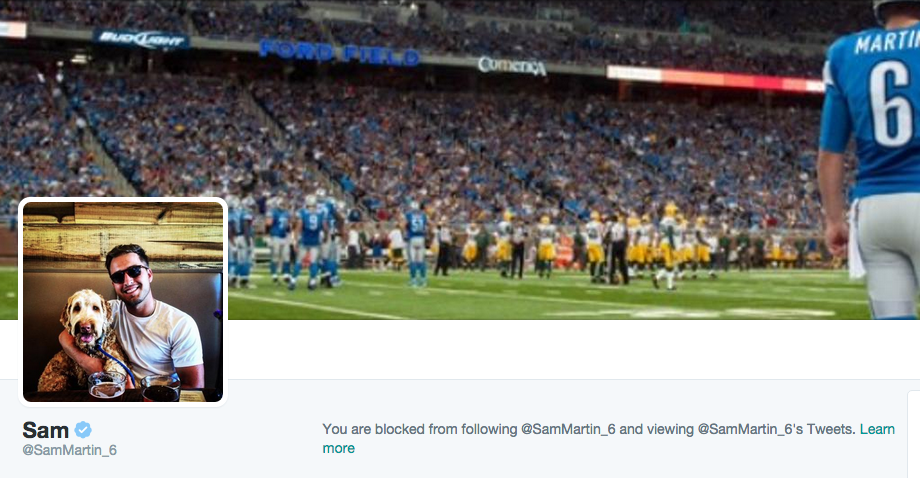 For the record, Sam Martin is a mental midget who searches his own name and blocks people on twitter who have said bad things about him…this is probably why he has had major issues punting in clutch situations in the past. I personally have never mentioned an athlete on twitter when talking about them because they do not need their mentions clogged by people bashing them. That’s how I know he searches his own name.