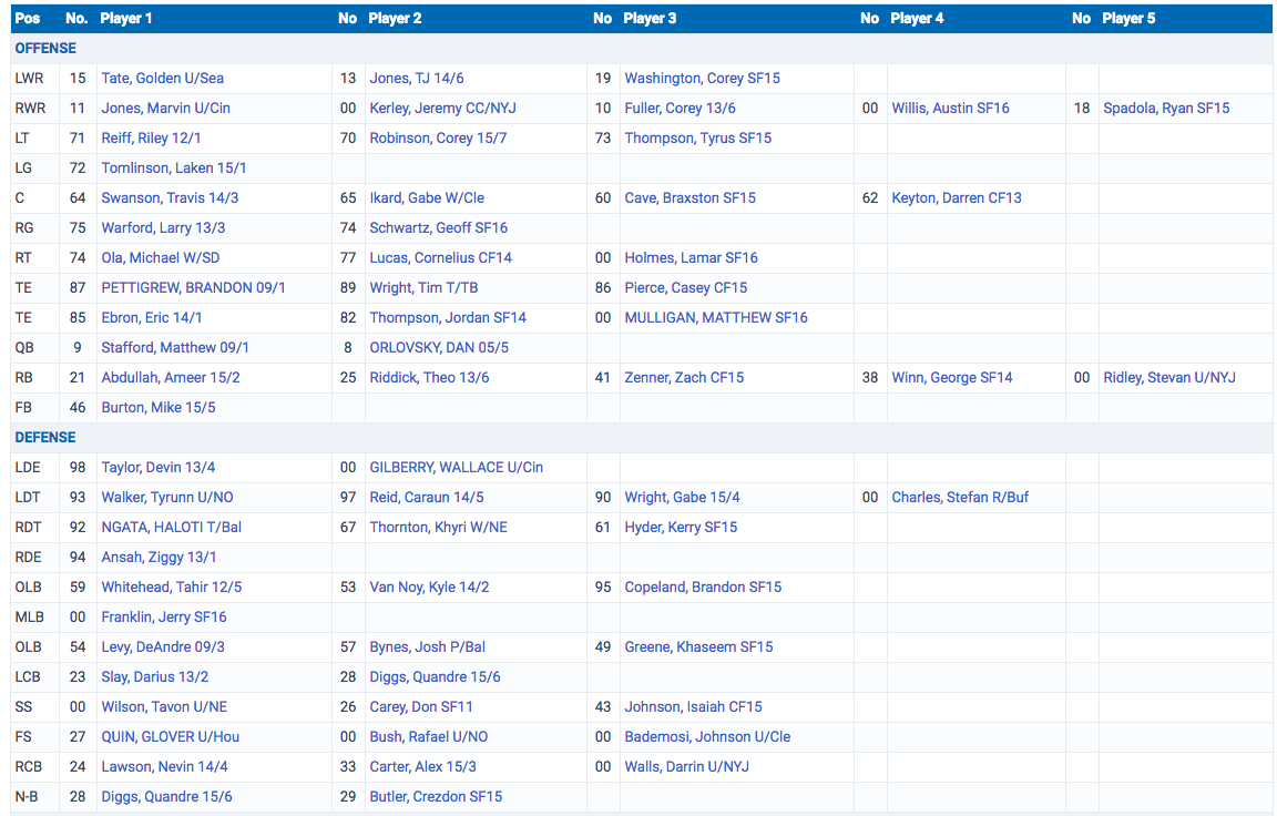 OL, DL, S, CB, OLB, WR, QB