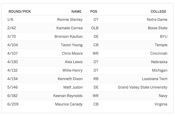 This draftย by the Ravens is arguably one of the greatest 4-7 rounds of all time. The Stanley pick was a great pick in terms of getting a franchise left tackle to protect Joe Flacco. I think Laremy Tunsil is a better player, but obviously the Ravens did not care for his off-the-field issues. I’m not the biggest Correa and Kaufusi fans, but they will help out the defense early and often. Five picks in the 4th round is absolutely unheard of and they used them almost to perfection. I liked the Tavon Young and Alex Lewis picks, but absolutely loved the Willie Henry and Kenneth Dixon picks. They got a highly underrated DT that is on the rise and Dixon is one of the top 5 running backs in this class. Then they went on and added Matt Judon, who I think is one of the true sleeper defensive ends of this draft. They filled a lot of needs and did it with a lot of good players in value spots. This was a great draft for the Ravens.