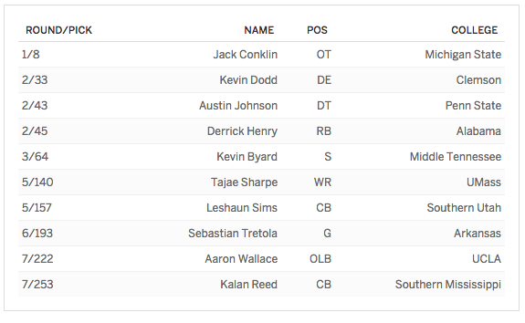 This is an excellent example of how you trade down and acquire picks and then trade up for a guy you want and move around the board. They took their batch of picks and used them in a very effective manner. The Conklin pick was a great pick in my eyes because he can slide in at RT and it allows Taylor Lewan to stay at LT because he refuses to move. Dodd and Johnson are going to infuse some young talent into the defensive line immediately and Henry gives you a monster talent in the backfield to go with Demarco Murray (obviously they don’t like Bishop Sankey).