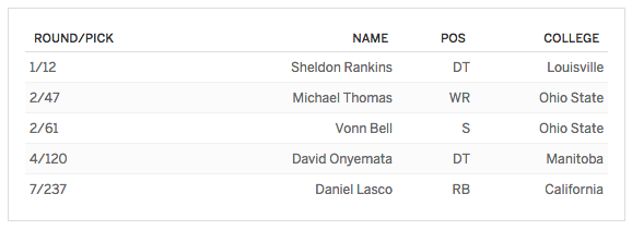 They only had 5 picks but they drafted 4 players that I liked a lot and one guy from Canada I know nothing about. All in all we’ll call this a very, very goodย draft. Rankins is a guy that I absolutely love and was sad that the Lions did not get him. He’s an absolute monster and reminds me a lot of Aaron Donald (though likely not as good). Michael Thomas is going to be a great player to go opposite of Brandin Cooks and they should create a great pair of size and speed. Vonn Bell is stud safety that is going to go great next to Kenny Vaccaro and Daniel Lasco is a highly underrated RB. He could end up taking snaps away from CJ Spiller, who seems to have trouble staying healthy. If you’re going to have this few of draft picks, it’s crucial to get players that will have an impact at need positions and I think that their first three picks will be Day One starters.