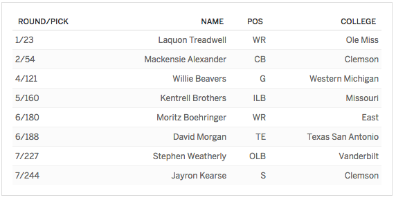 The Minnesota Vikings drove me absolutely nuts in the draft by taking a lot of players that I liked. Treadwell is the best receiver in the draft (in my opinion) and is going to be a great option for Teddy Bridgewater and a great compliment for Stefon Diggs. Mackensie Alexander slipped because he is smaller and did not have a college interception but I like him. Willie Beavers is a bit of a project but for a 4th round pick, the value is right. Kentrell Brothers was an efficient player in college and will be a good depth player, while David Morgan will jump right in as a blocking tight end and will help open holes for Adrian Peterson. Weatherly’s value is in his freak athleticism (6’4″ 267 lbs 4.61 40) and his ability to line up anywhere. Quite frankly, I thought he would go sooner because of his considerable talent but he just never produced. Kearse will be a good depth safetyย that needs to improve on his effort and his ability to help in the run game. All in all though this was a great draft. Don’t love the Boehringer pick, but oh well….can’t love them all.