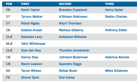 The secondary will be lead by Darius Slay and Glover Quin. Slay has developed into a Top 10 cornerback in the NFL and Quin has steadily become a rock solid free safety. Nevin Lawson is currently the starter at the other corner spot, but I’m not so sure he holds onto that for very long with Quandre Diggs progression. At any rate, Diggs will see plenty of playing time when the Lions go into a nickel set. Strong safety is the biggest question mark in the secondary and I’m not sold on Tavon Wilson as the starter. Rafael Bush is his backup and I’ll be curious to see if Bush makes a push for Wilson’s spot during the season. As per usual, Don Carey is the backup at free safety and I pray he does not have to play too often. This is definitely the biggest problem spot on the defense, even with Slay and Quin.