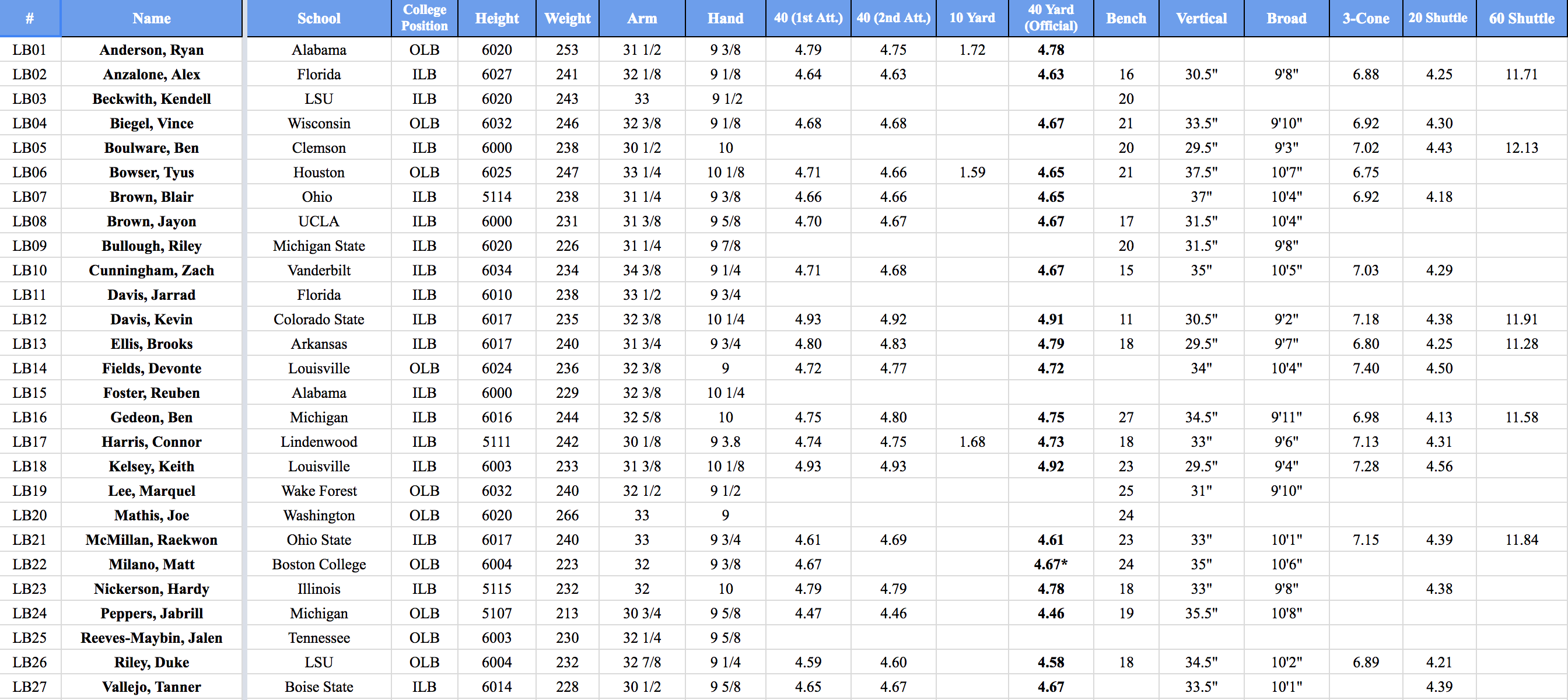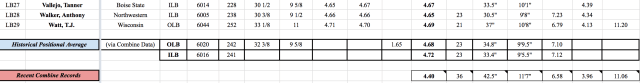 Haason Reddick, LB, Temple: Reddick was listed with the DEs and worked out with them because that is where he played in college (similar to Peppers situation), but I put him with the LBs because his numbers against most of the DEs are not a fair comparison. He’s only 6’1″ 237 lbs but he posted 1.59 10-yard split (4.52 40), 24 reps on the bench, a 36.5″ vertical and an 11’1″ broad jump. I’m hoping he falls to the Lions because he looks like he’s going to be an impact player.