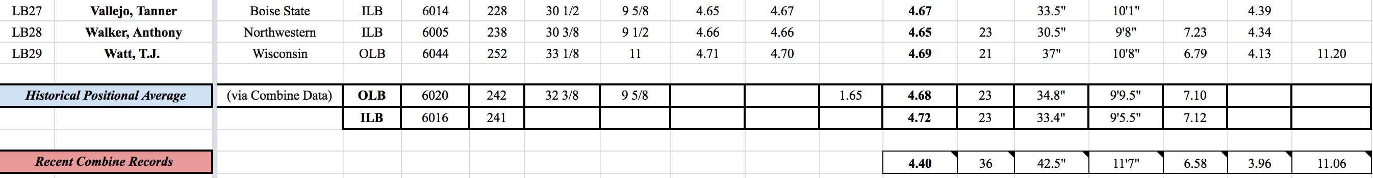 T.J. Watt, LB, Wisconsin: Probably the second best linebacker in the Draft after Reddick. Watt weighed in at 6’4″ 252 lbs, posted a 4.69 40, 21 reps on the bench, a 37″ vertical and a 10’8″ broad jump. He looked good during drills and was efficient with his movements. He’s going to be a good player in the NFL.