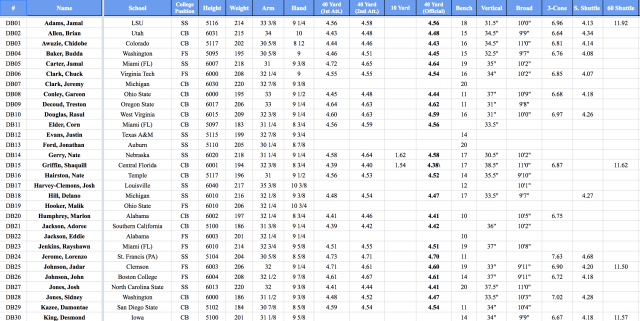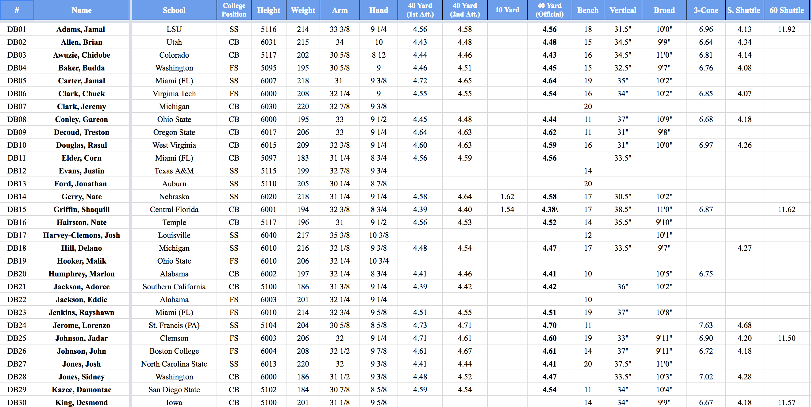 Jamal Adams, S, LSU: I’m not sure who will come off the board first between Adams and Hooker, but I do know that they are both studs. Adams weighed in at 5’11” 214 lbs, posted a 4.56 40, 18 reps on the bench, a 31.5″ vertical and a 10′ broad jump. He actually looked smoother during drills than I thought he would and I have high expectations for him.