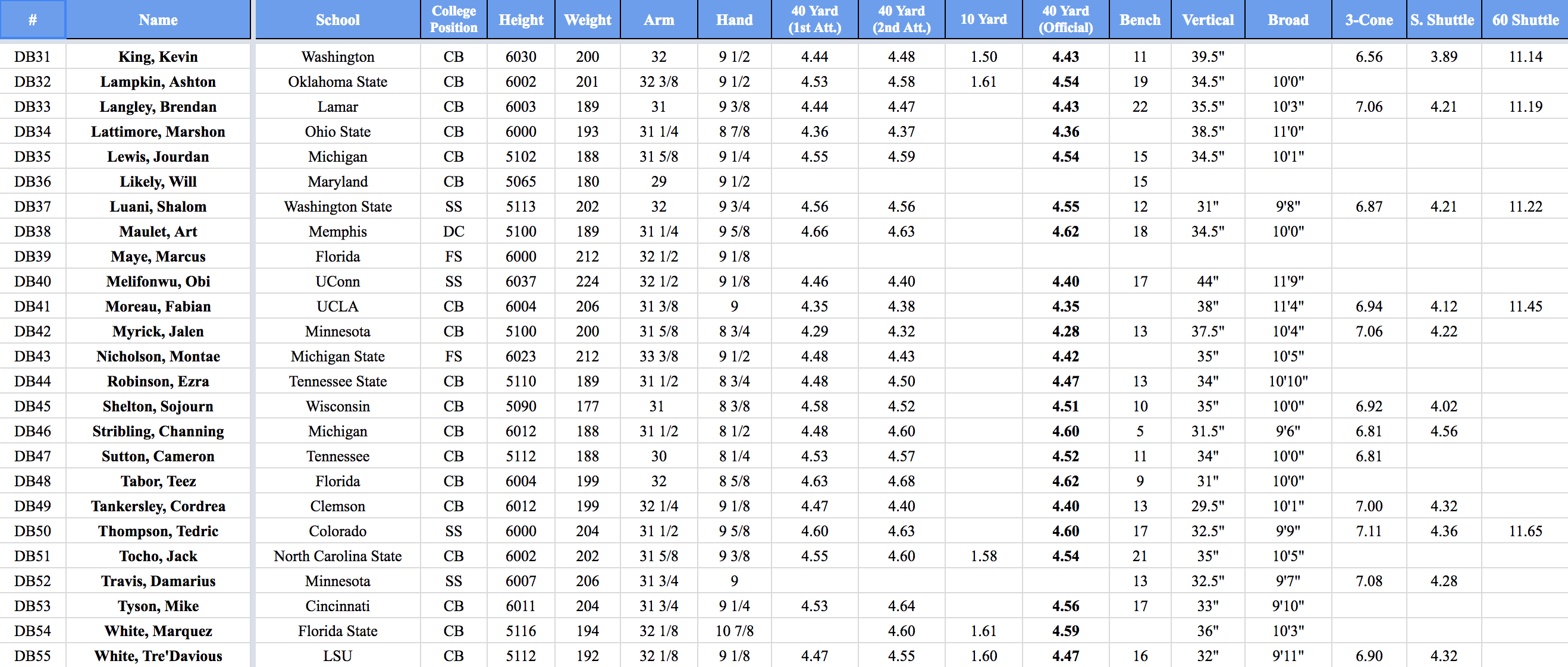 Obi Melifonwu, S, UConn: Apparently all the DB freakshows come out of UConn. Obi Melinfonwu has been climbing draft boards since the Senior Bowl, but no one was expecting this. He weighed in at 6’3″ 224 lbs and posted a 4.4 40, 17 reps on the bench, a 44″ vertical and an 11’9″ broad jump. Truly some asinine numbers. He’s going to get a look in the late first round simply because you cannot teach this type of athleticism.