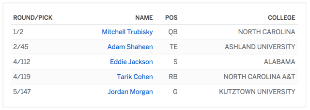 Man, do I feel for Chicago Bears fans right now. I’m not even remotely sold on Mitch Trubisky as a stud NFL quarterback and the fact they were negotiating with themselves to pay a King’s ransom to move up one spot is highly questionable. You would think that maybe they would draft some big time players with their other picks…but they went with Adam Shaheen, Eddie Jackson, Tarik Cohen and Jordan Morgan. It’s almost like they did not have the budge to scout any big name schools other than Alabama. Shaheen is an intriguing tight end but he’s not a good blocker despite his frame. He could start this year, but there were better options to fill holes in that slot. Eddie Jackson has potential to start but it will not be right away. Then they drafted Tarik Cohen to be a change of pace back for Jeremy Langford…but that was a bit early for my taste. The bottom line is they traded up for a guy that will not start Day One with Mike Glennon there and then they did not get any starters with their remaining five picks. A very frustrating day for Bears fans.