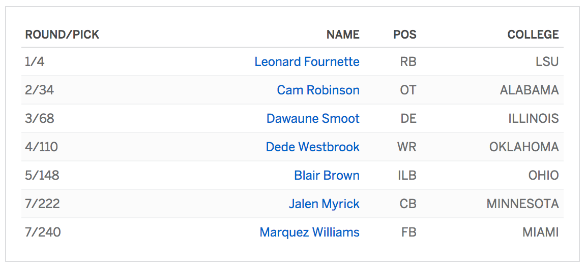 I could probably put the Jags draft in the boom or bust category at the end, but I’m really just not a fan of it. They got a work horse back in Fournette, but they already have T.J. Yeldon and Chris Ivory. It seems to me like a very poor allocation of draft capital and cap space to spend that much on those three running backs. He will likely be a stud, but there are so many holes on this team that there were other issues to address. Getting Cam Robinson in the second round was a nice pick up and if he can turn around his stagnant development, he will be a solid starter. Smoot has some intriguing traits as a pass rusher, but he does not have a track record of success which is not reassuring. Dede Westbrook is a good player but a terrible person. If he stays out of trouble, he could be a good player…but that’s a big if. On top of that, with Allen Robinson, Allen Hurns, Marqise Lee, and Rashad Greene already at wide reciever, there were other issues they could have addressed. Jalen Myrick is a freaky athletic corner, but he’s not going to have an impact anytime soon.