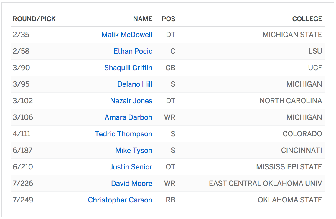 Personally, I do not mind the Seahawks draft, but it does raise some questions. Russell Wilson needs an offensive line and they only drafted two of them. One of which was Ethan Pocic, and they promptly announced him as a tackle. You can probably count the number of times moving a college center to tackle in the NFL has worked and I’m not a fan of the move. Malik McDowell is the definition of boom or bust. Going to Seattle gives him a higher chance of success, and he has incredible talent, but his motor is questionable and it’s going to be interesting to see if he can get it figured out.