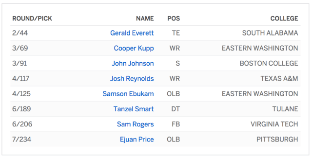 This is the type of draft where I liked some of the players they picked, but there were far too early for my taste. I like Gerald Everett and Cooper Kupp, but taking both of them in the Top 70 is not great. They want to get playmakers on offense but this was a deep draft at TE and WR. They could have waited to take a tight end instead of reaching for Everett and I would have rather taken Chris Godwin over Kupp in the third round. Josh Reynolds is an intriguing prospect in the fourth, but looking at their draft, I do not see any Day One starters, which is a bit of an issue when you’re a bad team. They were smart trying to get weapons, but I think they could have taken better players in those spots. Only time will tell which one of us is right.