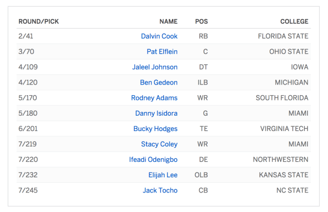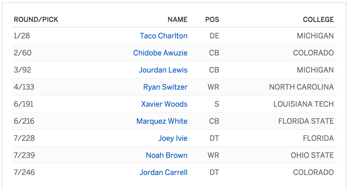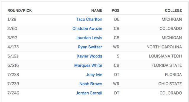 The Dallas Cowboys may have had my favorite draft of any team this year. If you had given the Lions this draft, I would have been pretty intrigued (though linebacker would still be a major issue). Taco is just scratching the surface of his potential and he’s got all the makings of being a stud pass rusher. Chidobe Awuzie is a corner that I wanted the Lions to take over Teez Tabor…Awuzie is a good athlete with solid size and he’s very sticky in man-coverage. Then the Cowboys took Jourdan Lewis, who will be an impact starter at slot corner if his legal troubles are behind him.