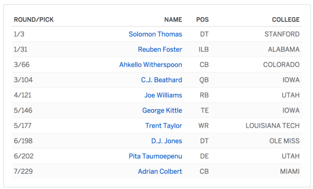 After that little hiccup, they rattled off Joe Williams, George Kittle and Trent Taylor, which was fantastic. Joe Williams is an intriguing player, with starter potential, and will be a good backup behind Carlos Hyde. George Kittle is an extremely athletic tight end and will make for a great addition to the offense. Taylor is an undersized wide receiver and does not have great athleticism, but he catches literally everything. No doubt a nice little security blanket for your quarterback.