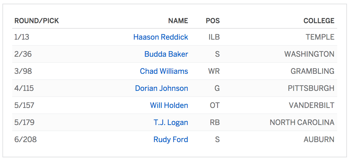 The Cardinals were a bit of an enigma last year. They were a team that was far more talented than their record and I will expect them to bounce back rather quickly…especially after this draft. Haason Reddick is an instant plug-and-play starter that I would have loved for the Lions to get. Budda Baker is a playmaking safety that is going to make for a potent defensive backfield with Tyrann Mathieu and Patrick Peterson. Losing Tony Jefferson in free agency obviously hurts, but they at least did the prudent thing and tried to address it.