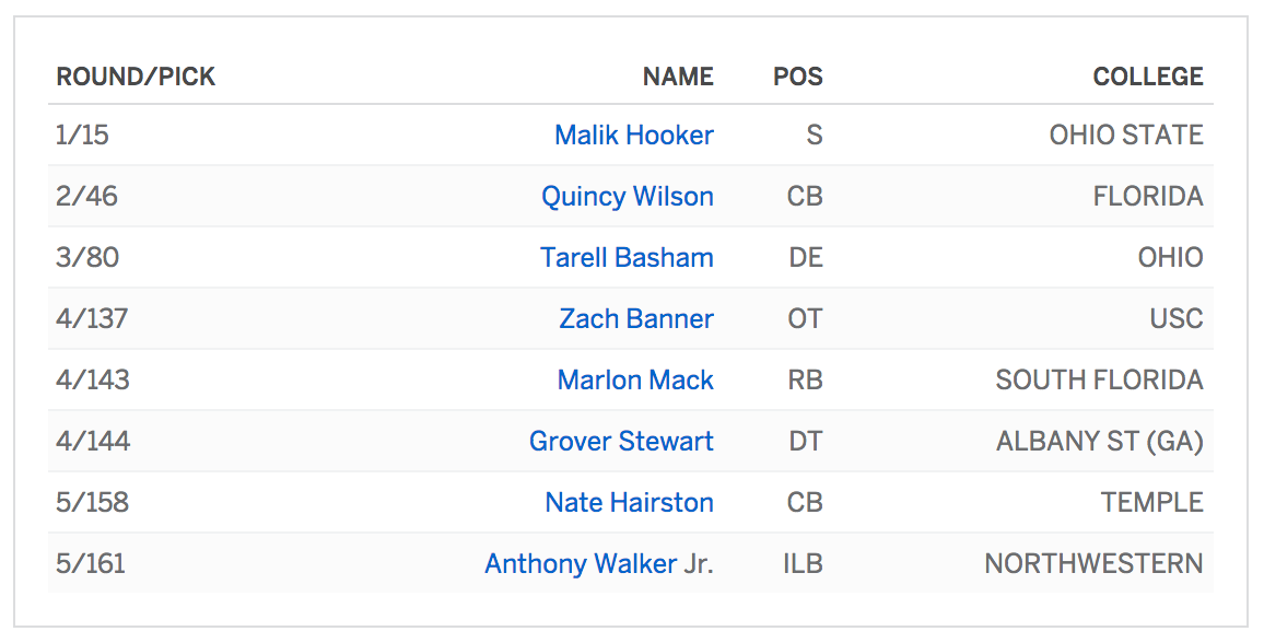 The Colts first three picks were absolutely outstanding. It went a bit off the rails with a major reach in the 4th with Zach Banner, but the first three players all fell right into their lap and they just kept hitting home runs. Malik Hooker is a tremendous safety and is going to be a great addition to their defensive backfield. Then you add in Quincy Wilson, with his prototypical size and cover skills and you have two Day One starters in your defensive backfield. Tarell Basham is going to be a solid backup right from the get-go and he could develop into an impact pass rusher. He has work to do with his pass rush skills, but he has the NFL build and athleticism to be successful.