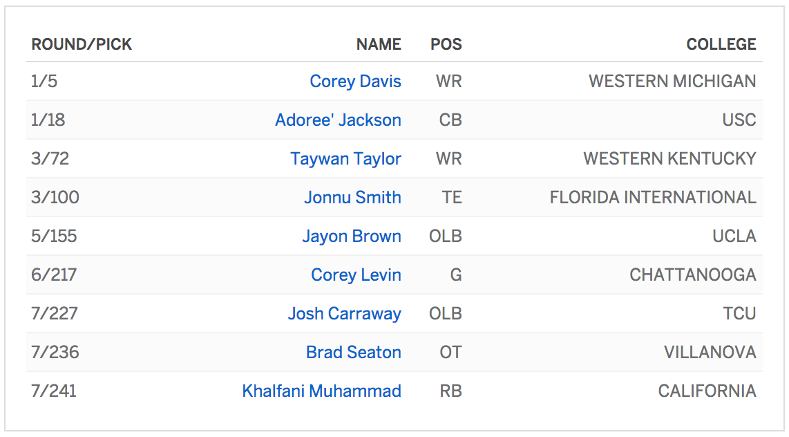 The Titans draft was a very polarizing one because they took Corey Davis so early. I think Davis is a #1 WR, but when you take a wide receiver at #5, typically you expect him to be Calvin Johnson, Julio Jones, A.J. Green, etc. I do not think that’s the type of player he will end up being, but he’s certainly better than any of the wide receivers they would have gotten at #18. So getting Corey Davis and Adoree Jackson with your two first round picks is very solid in my book. Adoree has unbelievable athleticism and will return punts right away. Clearly they wanted to get Marcus Mariota some more toys to go with Demarco Murray and Derrick Henry, because they went with two more pass catchers after Adoree. Taywan Taylor is a slot ninja and is going to be a contributor right away. Jonnu Smith has a ton of athleticism, and it will be interesting to see how the Titans use him as a rookie. He definitely could be a matchup nightmare for defenses especially as he develops.