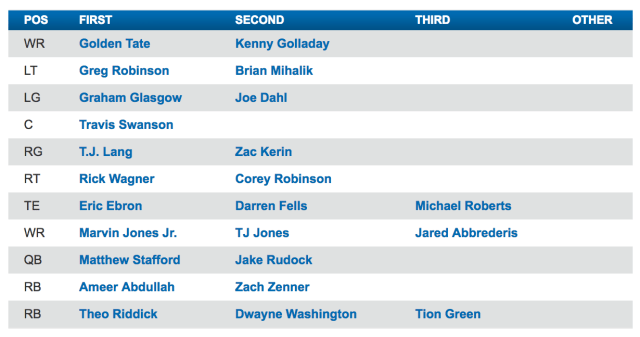 You know the drill, Matt Prater is sick. Sam Martin is solid but he’s hurt so Casey Redfern is starting. Pretty basic stuff. The real intrigue is in the return game. Dwayne Washington has been good returning kicks and I love watching Jamal Agnew return punts. I really hope they do not use TJ Jones or Golden Tate and give Agnew a shot because he’s fun to watch.