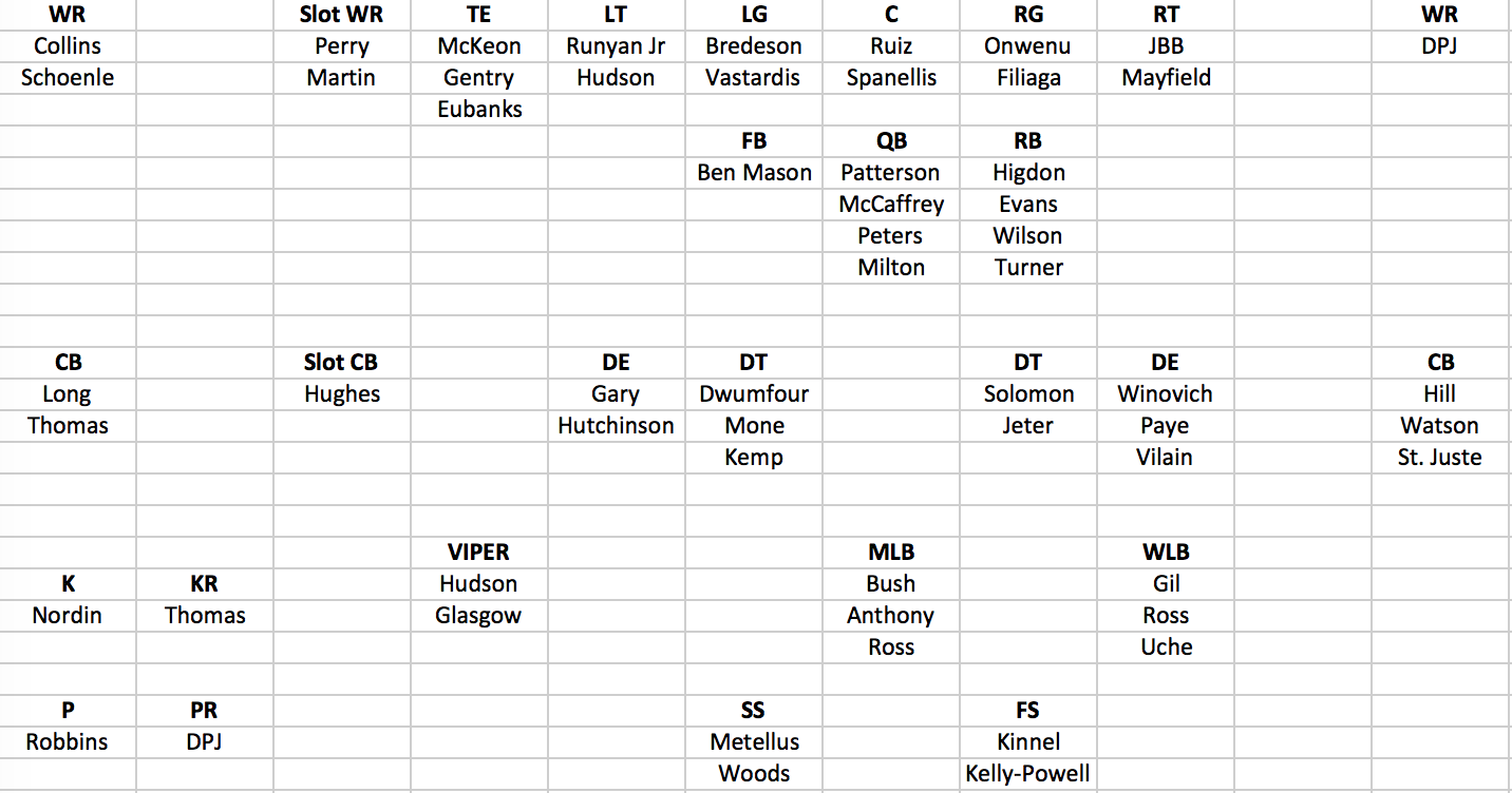 As for special teams…Quinn Nordin will kick and who knows who will punt. Chris Partridge said that there were three punters in the mix for the job and after last season, I’m not sure what to make of the situation. Brad Robbins was supposed to be the best freshman punter last year and he was absolutely awful when he got looks. He’s hurt right now, but I would expect him to start when healthy. I would also expect Donovan Peoples-Jones to return punts and Ambry Thomas to return kicks…unless of course someone new has emerged in camp. Without a Spring Game this year it seems like we’ve got less information than ever before.