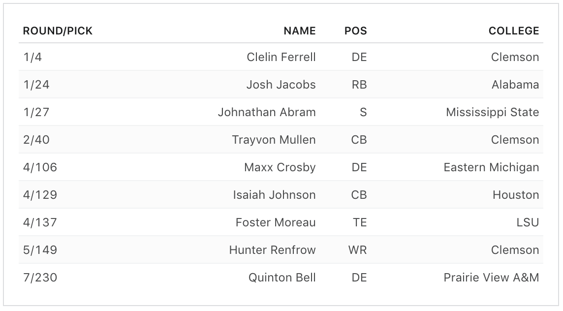Taking Clelin Ferrell for me is a big issue. He’s a good player, but they could have traded down 6-8 spots and it STILL would have been early to take him. Josh Jacobs has been written in sharpie on every mock draft at the 24 spot for months and I’m still not sure why they did not trade down and take him. I mean, sure, Marshawn Lynch is most likely retired, but is Jacobs really a first round difference maker? I like him as a player, but I do not value running backs enough to take them in the first round. After those two picks though, I really liked what they did with the draft. They moved around the board, they still got some players. Mullen was a little early for my taste, but I’m not going to ding them for that at all. I think that Maxx Crosby is a sleeper candidate to start this year and Foster Moreau and Hunter Renfrow should be reliable contributors right away.