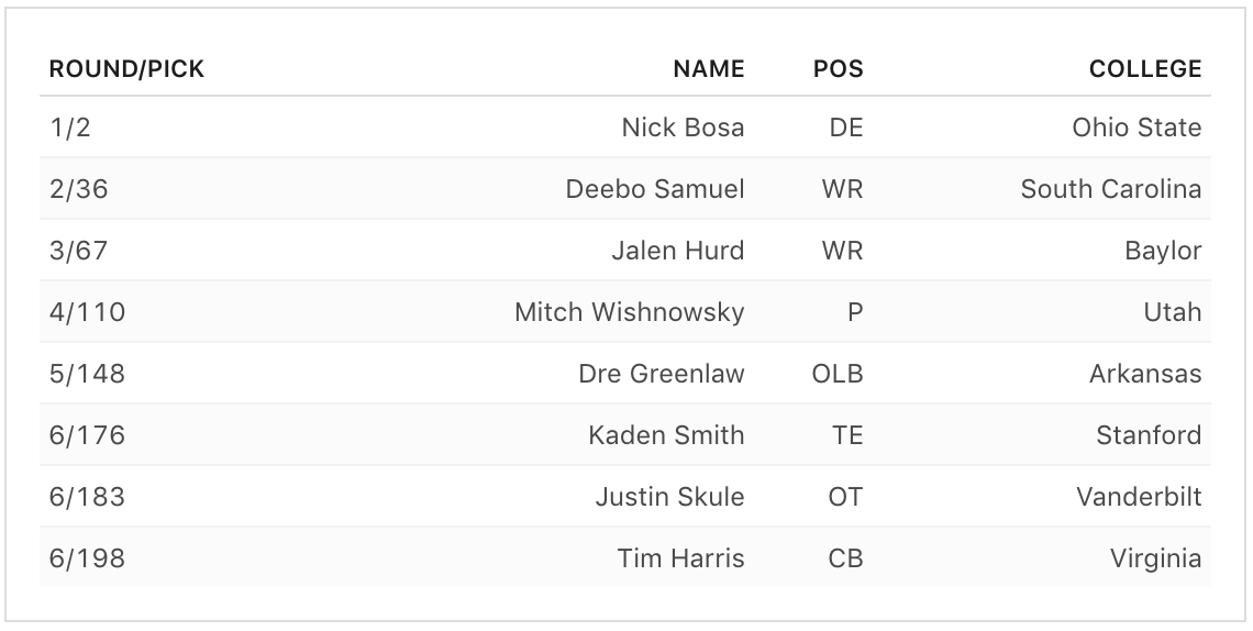 Okay, let me start this off by saying that Nick Bosa is a stud and I love Deebo Samuel. Those were two great picks. I think Jalen Hurd is going to be a nice offensive weapon for them, but it felt an awful lot like a luxury pick. They already have Dante Pettis, Marquise Goodwin and Jordan Matthews on the roster AND they added Deebo the round before him.