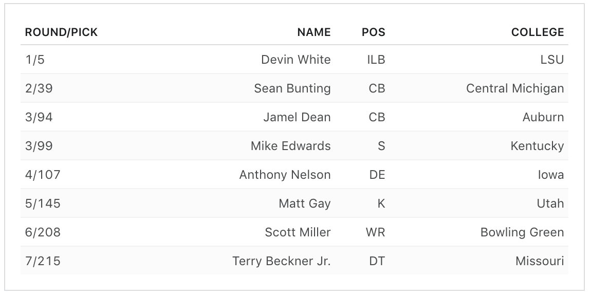 The Bucs had an interesting draft. The Devin White pick was a solid one, predictable, but solid. They obviously felt that defense was a major need since their first five picks addressed the defense. The 2nd round is early for Sean Bunting for me and I like Dean’s speed but that’s about it. Edwards and Nelson will likely be contributors, but then to draft a kicker after all of that? Sure, Gay is a solid kicker and they’ve had well-documented issues kicking recently, but they had plenty of needs on offense that were not addressed.
