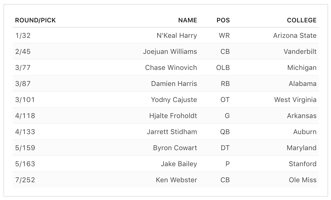 I don’t know how Bill Belichick continues to do it, but he does. Letting guys walk each year, getting more comp picks, and then moving around the board and making great pick ups. I like N’Keal Harry a lot and I’m very intrigued to see if the first WR taken in the first round by Belichick will pan out. Adding Joejuan williams and Chase Winovich were fantastic for their next two picks and I think both of them will end up starting/being major contributors this year. Damien Harris joins a crowded backfield and while they may not need him this year, Rex Burkhead can be cut next year and save the Pats $3 Million.