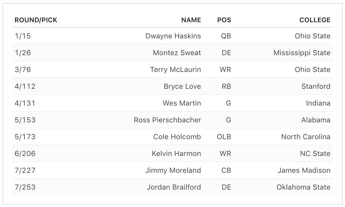 Terry McLaurin is a great pick up in the 3rd round and he will contribute on offense and special teams right away. I also love the Ross Pierschbacher pick and think that he will be an eventual starter on the interior line. Bryce Love is an intriguing pick and since they have an absolutely loaded depth chart, they will likely put him on the PUP list to start the year and will not need anything from him any time soon. I’m not sure if it was really a necessary pick with their depth, but if he can make a complete recovery from this injury, he and Guice could form a potent pair in the future.
