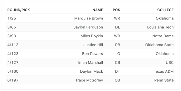 Adding Marquise Brown, Miles Boykin and Justice Hill with three of their first four picks lets you know that the Ravens are working HARD to get weapons around Lamar and they are going to be absolutely explosive. Miles Boykin may have a few issues as a wide receiver, but his athleticism is most certainly not one. Marquise and Justice are two explosive weapons and this offense might cause major problems next year. Adding Ben Powers gives them some depth on the offensive line and Iman Marshall can be a backup in multiple spots in the secondary. Daylon Mack is going to get some run in the interior DL and he is an absolute space eater at 336 lbs.
