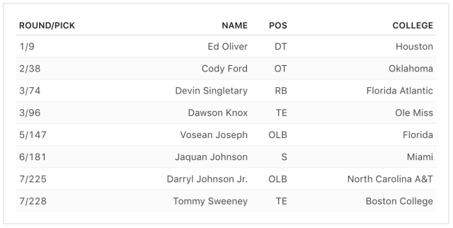 Dawson Knox was a nice addition at tight end and while he’s not very refined as a route runner, he’s explosive, has sure hands and is a solid blocker. Vosean Joseph should start on special teams this year and could even develop into a starter.