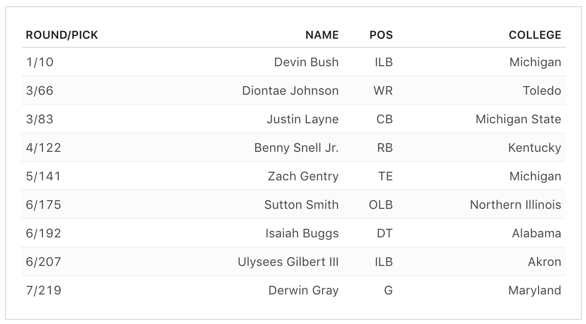 Justin Layne is incredible value in the third round and Benny Snell is going to be a great back to go with James Conner. Zach Gentry is absolutely horrible value in the 5th round, but getting Sutton Smith and Isaiah Buggs in the 6th makes up for it. Gentry probably should not have even been drafted with his athletic profile and drop issues, but this is the lone blemish of their class. Smith will be a good depth addition and if Buggs can get his life together, he will outperform that 6th round pick slot.