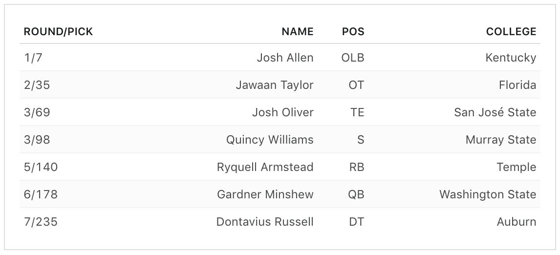 Really loved them adding Josh Allen and Jawaan Taylor with their first two picks. Josh Oliver is a sneaky good pick in the third but the rest is very meh. Quincy Williams went really early for me and I do not see the others as contributors any time soon. Those first 3 picks were real solid though.