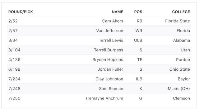 Terrell Lewis and Terrell Burgess will be good rotational pieces and both could end up starting this year. I’m just not sure I understand the second round picks. Hell, I do not like the Brycen Hopkins pick with how well Gerald Everett and Tyler Higbee have performed, but Everett’s contract is going to be up after this year and they probably will not be able to keep him. That pick I at least can understand.