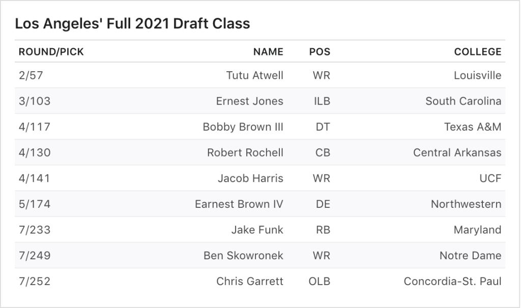 Ernest Jones was a good value pick and could start, and I do not mind some of the darts they threw on guys like Jacob Harris and Jake Funk…but at what point were they going to address the offensive line? Not only that, but the defense is also not going to be as good this year after losing Troy Hill, John Johnson, Michael Brockers, and Samson Ebukam. You cannot reach for needs but you also cannot just fail to address them. I like their draft far more if they take Nick Bolton or Creed Humphrey instead of Tutu.