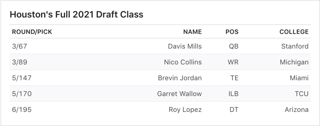 So knowing how absolutely hosed you are, how do you draft a QB this early? You should be planning on drafting #1 or #2 next year and getting ready to take a QB there. Then you used valuable draft capital to trade up for Nico Collins? I mean, I like Nico, but they should have been trading down and throwing darts as much as possible. This roster is a disaster so sure, take Brevin Jordan in the 5th because why not. Nevermind his brutal testing that did not match his tape or the fact you’ve got six warm bodies to start on defense. I have no idea what the Texans were doing or thinking but this team is clearly in disarray and is not going to be any good any time soon.