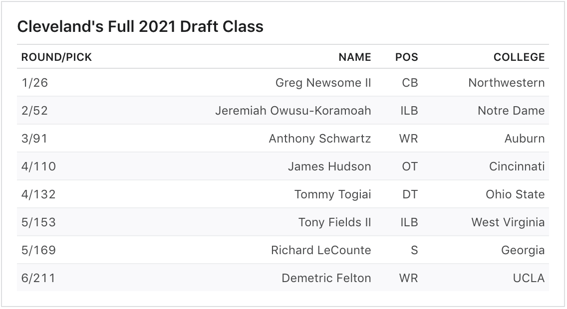 This is a draft class that is littered with talent, potential and question marks. Greg Newsome is talented but has a very checkered injury history. Jeremiah Owusu-Koramoah is another supremely talented player, but he also fell in the draft because of medical issues. Anthony Schwartz might be the fastest player in the draft, but I’m not sure they needed a third round wide receiver. I like the James Hudson pick, but he’s another guy that is inexperienced and needs to still develop as a tackle.