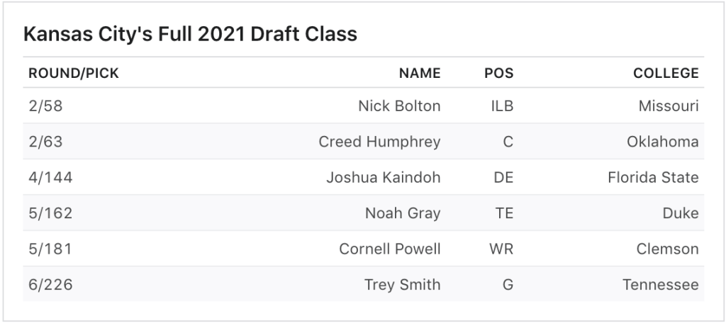 Gray was good at the Senior Bowl and I’m a big Cornell Powell fan…both of which will provide depth on offense and I think Powell could end up starting/contributing big time as a rookie. The best value pick may have been Trey Smith though. He fell because of medical issues but he is supremely talented and is far better than most (if not all) prospects that were going at that point in the draft