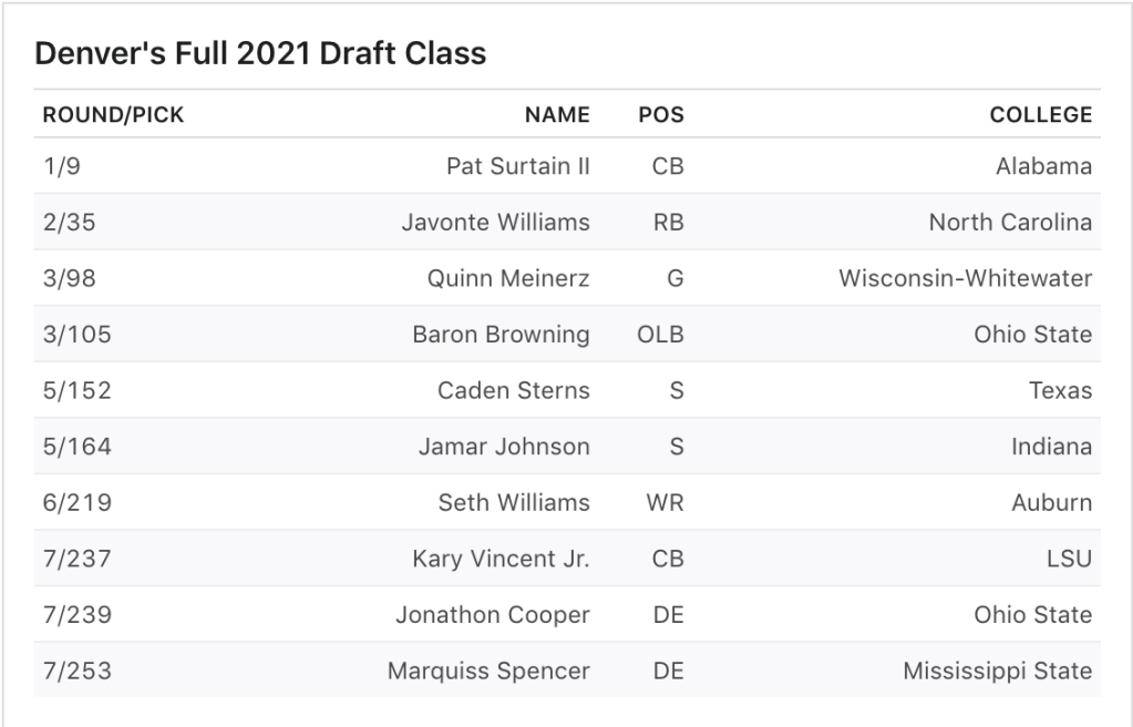 I thought about excluding Denver because they could have taken Justin Fields, but it is hard to dismiss this class when you look at all of the value they got. Surtain was an excellent pick at cornerback, which was a major position of need for them. They traded up for Javonte Williams after letting Phillip Lindsay walk and Melvin Gordon only has one year left on his contract. I’m a major Javonte Williams fan, he’s an absolute bowling ball and I think he will take over the starting job later this season.