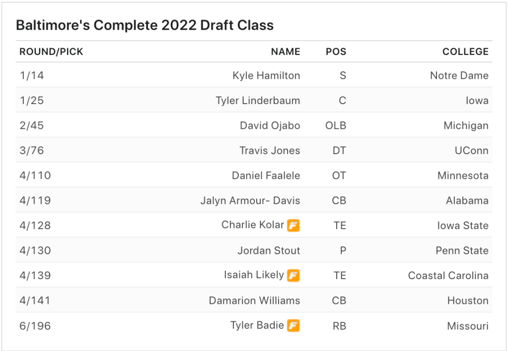 Then you mix in adding Faalele to shore up your offensive line depth and two more pass catching weapons in Kolar and Likely. I’m guessing they will use Likely as a big slot given they have Mark Andrews. The Andrews and Kolar tandem will give them some great blocking in two tight end sets as they likely shift back to an even heavier run first offense than before. The only question mark for me here was not taking a stab at another WR after they traded Hollywood Brown to the Cardinals for pick 25. I’ve got to assume that they will add a free agent wide receiver at some point, but all in all this was a fantastic draft.